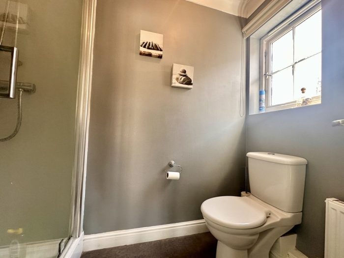 EN SUITE shower cubicle with mains shower fittings; wc; pedestal wash hand basin with mixer tap; radiator; extractor fan; frosted window.