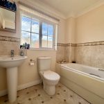 SPACIOUS BATHROOM bath with mixer tap; wc; pedestal wash hand basin with mixer tap; radiator; frosted window; extractor fan.