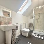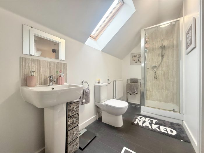 EN SUITE SHOWER ROOM 11' 2 max " x 5 max ' (3.4m x 1.52m) fitted with a white suite comprising of a pedestal hand wash basin with mixer tap over, low level wc, corner quadrant shower cubicle, tiled splashbacks, wall mounted shower unit, roof light window to side.