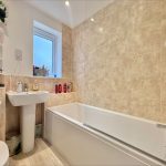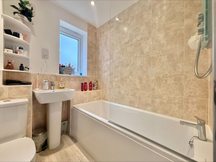FAMILY BATHROOM 6' 1 max " x 5' 11 max " (1.85m x 1.8m) fitted with a white suite comprising of a low level wc, pedestal hand wash basin with mixer tap over, panel both with mixer tap, shower screen and wall mounted electric shower unit over, tiled splashbacks, shaver point, UPVC double glazed window to side.