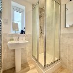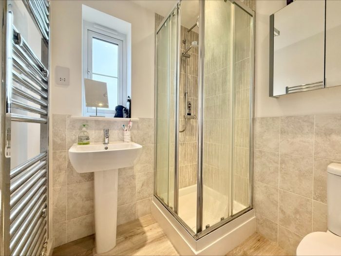 EN SUITE SHOWER ROOM 5' 3 max " x 6' 2 max " (1.6m x 1.88m) fitted with a white suite comprising of a pedestal hand wash basin with mixer tap over, low level wc, corner quadrant shower cubicle with sliding shower screen doors and wall mounted shower unit with hand and soaker attachments, UPVC double glazed window to front, shaver point, extractor fan, heated towel rail radiator.