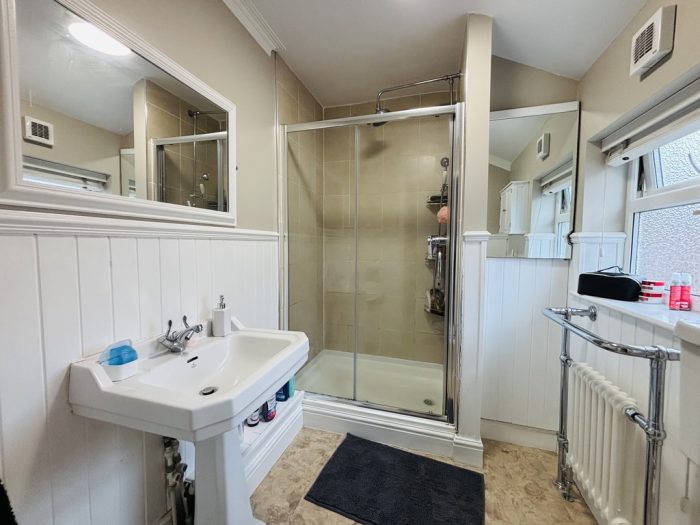 SHOWER ROOM 7' x 5' (2.13m x 1.52m) double walk in shower, wash basin, toilet, boiler cupboard.