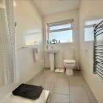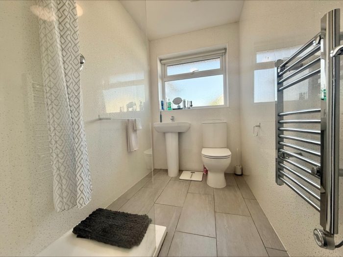 SHOWER ROOM 8' 5" x 4' 11" (2.57m x 1.5m) fitted with a white suite comprising of a low level wc, pedestal hand wash basin with mixer tap over; walk-in shower cubicle with shower screen and wall mounted soaker style shower, aqua board wall coverings, UPVC double glazed window to rear, extractor fan, heated towel rail radiator.