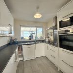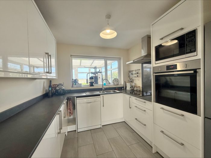KITCHEN 9' 5" x 8' 4" (2.87m x 2.54m) fitted with a range of wall and base units with roll edge work surfaces over, inset 1½ bowl single drainer sink with mixer tap over, inset four ring induction hob with splashback and cooker hood over; built-in Neff slide and hide electric oven; space for fridge freezer, plumbing for dishwasher, UPVC double glazed window to rear.