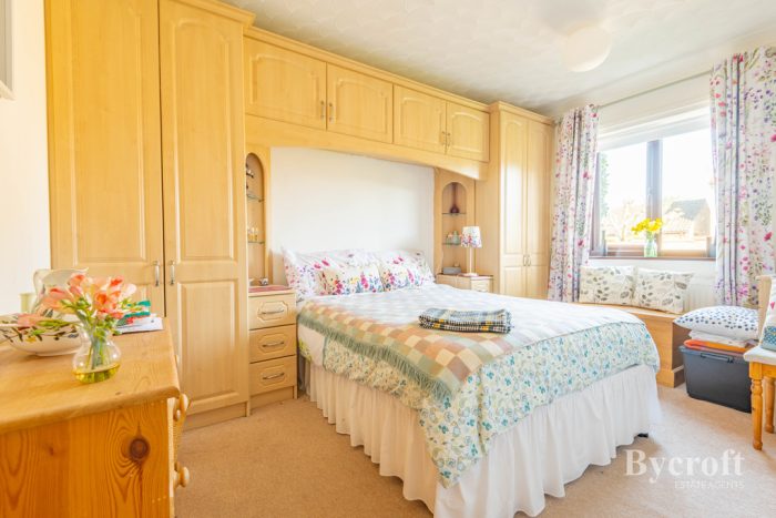 BEDROOM 1 12' 11" x 8' 11 incl wardrobes" (3.94m x 2.72m) fitted wardrobes comprising of two double wardrobes, double bed recess with bed side units and eye-level storage cupboards, window to front aspect, radiator.