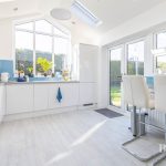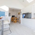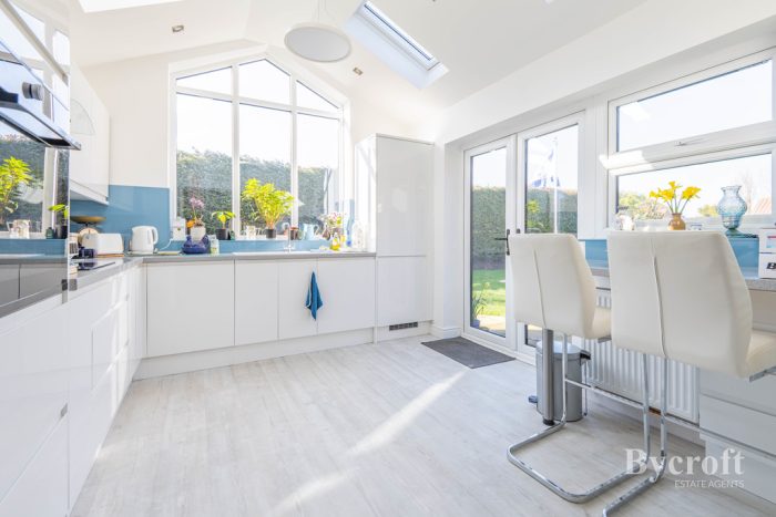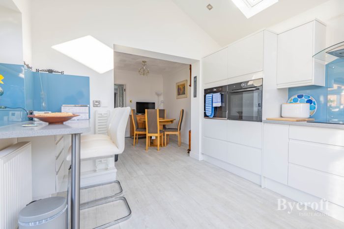KITCHEN DINER 22' 11" x 10' 8 max" (6.99m x 3.25m) recently fitted kitchen with L-shaped worktop, range of base, cupboards and drawers, integrated dishwasher and upright fridge freezer, two eye-levels ovens with warming drawer, four ring hob, one bowl sink mixer tap, range of wall units, breakfast bar, radiator, vaulted ceiling with four Velux roof lights, downlights, two radiators, feature window to rear aspect, further side window and French doors to the rear garden.