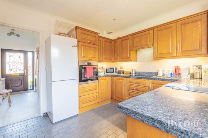 UTILITY ROOM 10' 5" x 9' 11" (3.18m x 3.02m) U-shaped worktop, range of base, cupboards and drawers, space and plumbing for washing machine, eye-level oven, space for upright fridge freezer, stainless steel one bowl sink with mixer tap, four ring hob, range of wall units, concealed light and extractor, glass fronted display unit, end shelf unit, window and door to rear garden, radiator, downlights, tiled floor.