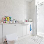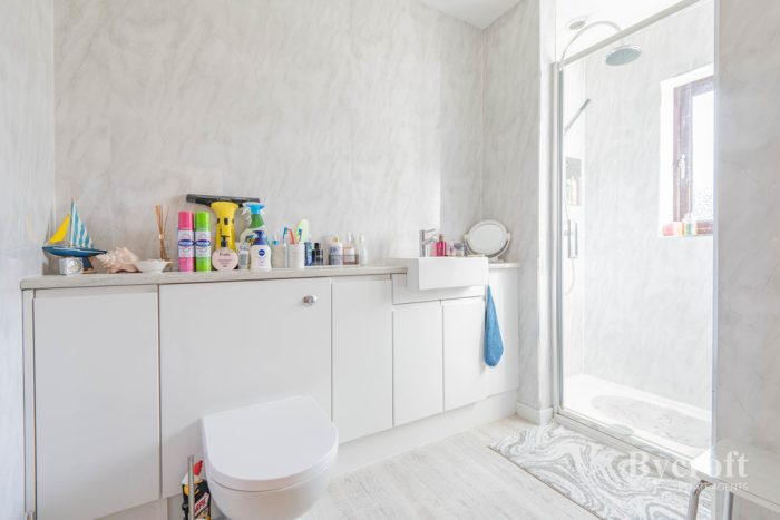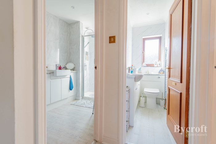 SHOWER ROOM spacious room comprising of vanity unit, wc with concealed push button cistern, hand was basin with mixer tap, storage cupboards, shower cubicle with mains fittings, two shower heads, aqua boarding, chrome heated towel rail, frosted double glazed window, downlights.