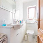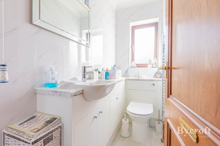 SEPARATE CLOAKROOM L-shaped vanity unit comprising hand wash basin with mixer tap, wc with concealed push button cistern, storage cupboards, aqua boarding, chrome heated towel rail, frosted double glazed window, downlights.