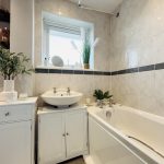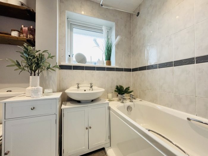 BATHROOM 7' 4" x 6' 3" (2.24m x 1.91m) white suite comprising low level wc; pedestal wash basin; bath with electric shower over and glazed shower screen; part tiled walls; heated towel rail; upvc double glazed window to front.