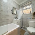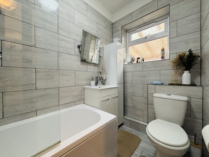 BATHROOM 7' x 4' (2.13m x 1.22m) modern room with fully tiled surround, UPVC window to side aspect, wc, hand wash basin, vanity unit, bath with mains shower fittings over, towel radiator.