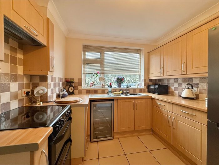 KITCHEN 11' 6 max " x 9' 3 max " (3.51m x 2.82m) fitted with a range of wall and base units with roll edge work surfaces over, inset 1½ bowl stainless steel sink with mixer tap over, space for fridge freezer, space under counter fridge, space for electric cooker with cooker hood over, tiled splashbacks, UPVC double glazed window to side.