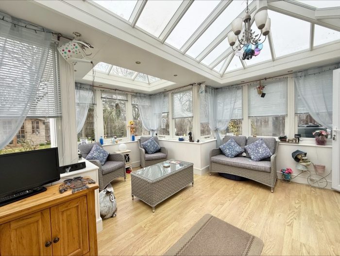 CONSERVATORY 14' 11 max " x 13' 5 max " (4.55m x 4.09m) with a glass roof with double glazed windows to the rear and side aspects, double glazed French door to side.