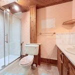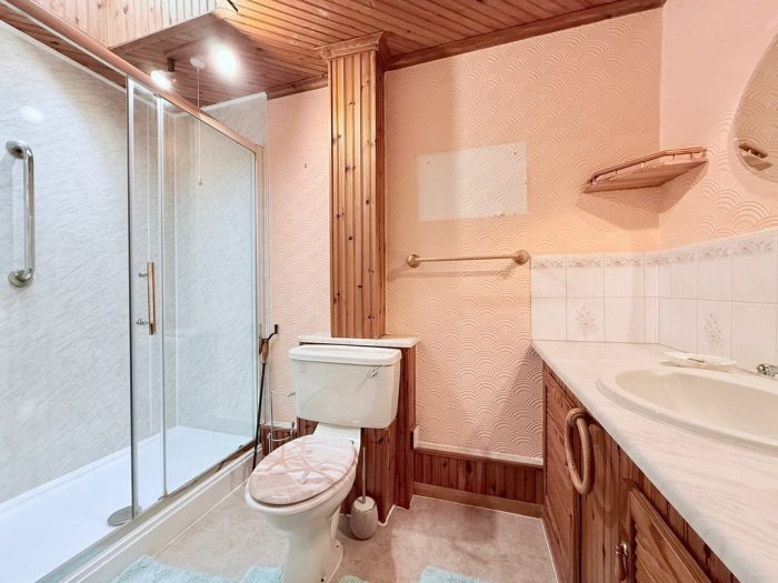 SHOWER ROOM large shower cubicle with Triton electric fittings, wc, vanity unit with hand wash basin with mixer tap and storage cupboards under, extractor fan, chrome heated towel rail.