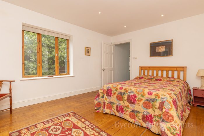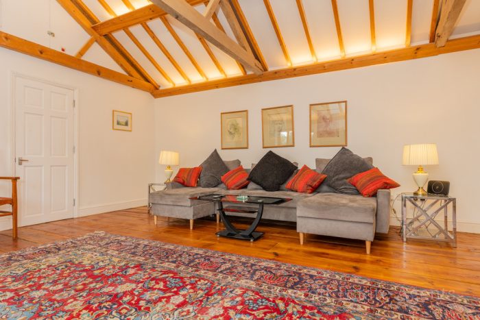 SITTING ROOM 23' 4 max minus stairwell" x 17' 10" (7.11m x 5.44m) with two double glazed windows to rear, archway window to side, vaulted ceiling with stunning exposed timber beams and flooring.