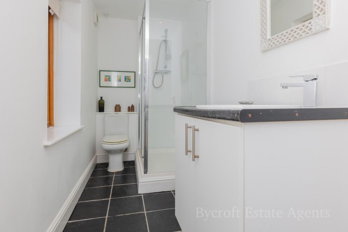 EN SUITE SHOWER ROOM 11' 8" x 4' 7" (3.56m x 1.4m) fitted with a white suite comprising of low level wc, vanity hand wash basin with mixer tap over and storage cupboards below, shower cubicle with sliding screen door and wall mounted shower unit, tiled splashbacks, double glazed window to front.