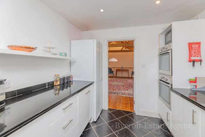 KITCHEN 10' 10" x 8' 9" (3.3m x 2.67m) fitted with a range of base units with granite work surfaces over, inset 1½ bowl sink with mixer tap over, two electric four rings hobs, two built-in electric ovens, space for fridge freezer, double glazed window to rear. There is loft storage above the kitchen and dining room.