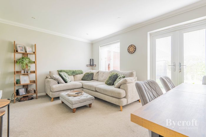 LOUNGE DINER 15' 5" x 10' 9" (4.7m x 3.28m) window and French doors to rear garden, radiator, modern electric wall hung fire, downlights.