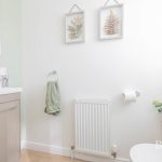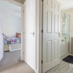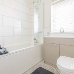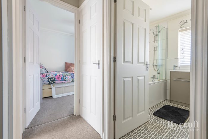 BATHROOM bath, mixer tap, mains shower fittings, fitted shower screen, vanity unit comprising of hand wash basin with mixer tap, wc with concealed push button cistern, storage cupboard, frosted double glazed window, chrome heated towel rail, downlights, extractor fan.