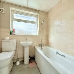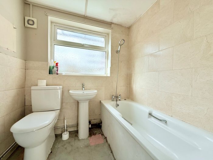 GROUND FLOOR BATHROOM wc, pedestal hand wash basin with mixer tap, bath with mixer tap and shower attachment, frosted double glazed window, gas boiler, radiator, extractor fan.