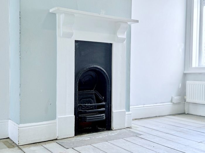 BEDROOM 2 11' 5" x 10' 7 max plus staorage cupboard" (3.48m x 3.23m) cast iron feature fireplace, window to rear aspect, radiator. Door off;