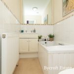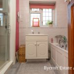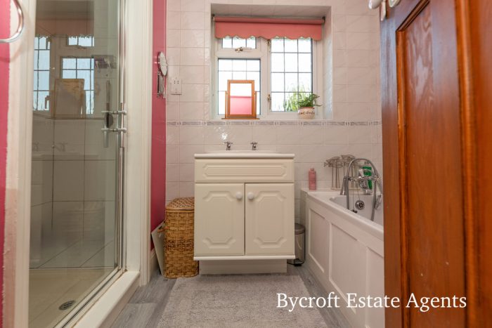 BATHROOM bath with mixer tap and shower attachment; hand wash basin; walk in shower cubicle with an electric wall mounted shower unit; UPVC double glazed window to side aspect.