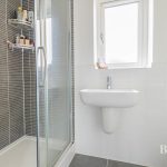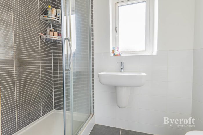 EN SUITE SHOWER ROOM shower cubicle with electric fittings, wall hung hand wash basin with mixer tap, wc with concealed push button cistern, frosted double glazed window, tiled floor, downlights, extractor fan.