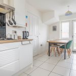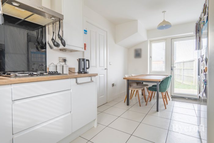 KITCHEN DINER 16' 11" x 9' (5.16m x 2.74m) U-shaped worktop, range of base, cupboards and drawers under; integrated dishwasher and eye-level Indesit oven and grill, space for upright fridge freezer, four ring gas hob, stainless 1½ bowl sink with mixer tap, range of wall units, cupboard housing Valient gas boiler, light and extractor, windows to front and side aspect, radiator, windows and doors to rear garden, tiled flooring and downlights.