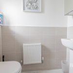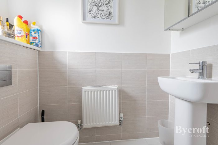 DOWNSTAIRS CLOAKROOM wc with concealed push button cistern, pedestal hand wash basin with mixer tap, tiled floor, frosted double glazed window.