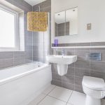 FAMILY BATHROOM bath with mixer tap and shower attachment, wall hung hand wash basin with mixer tap, wc with concealed push button cistern, frosted double glazed window, tiled floor, chrome heated towel rail, shaver point, downlights.