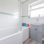 BATHROOM modern suite comprising of shower bath with shower screen and mains fittings, vanity unit with hand wash basin and mixer tap with double cupboard under, wc with push button cistern, fully tiled walls, chrome heated towel rail, frosted double glazed window.