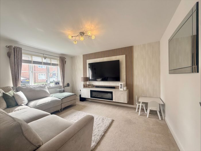 SITTING ROOM 13' 3" x 10' 10" (4.04m x 3.3m) UPVC double glazed window to front, feature paneled wall, inset storage cupboard, electric fireplace.