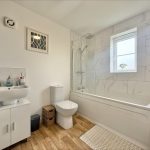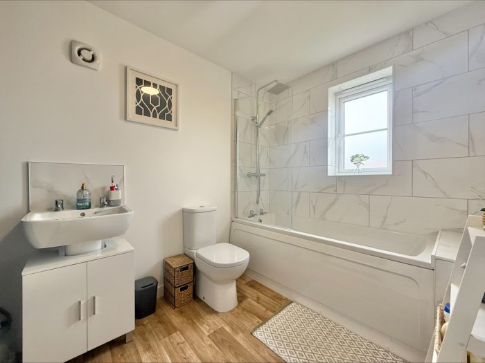 FAMILY BATHROOM 8' 2" x 6' 5" (2.49m x 1.96m) fitted with a white suite comprising of a pedestal hand wash basin, low level wc, panel bath with shower screen and wall mounted shower unit with hand and soaker attachments, tiled splashbacks, UPVC double glazed window to side, extractor fan.