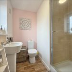 EN SUITE SHOWER ROOM 6' 5 max into shower cubicle" x 6' (1.96m x 1.83m) fitted with a white suite comprising of a low level wc, pedestal hand wash basin, tiled splashback, UPVC double glazed window to rear, extractor fan.