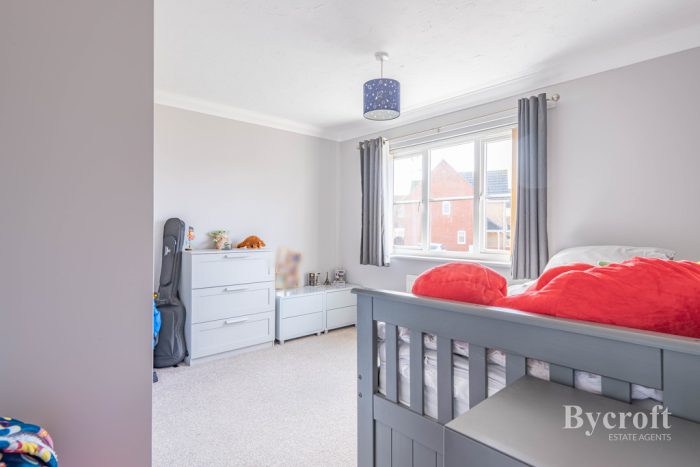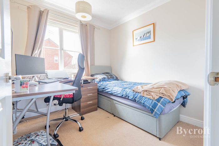 BEDROOM 3 8' 2" x 7' 8 plus wardrobe" (2.49m x 2.34m) built-in double wardrobe, window to rear aspect, radiator.