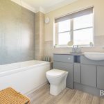 BATHROOM recently installed with bath with mixer tap and shower attachment, shower screen, vanity unit comprising wc with concealed push button cistern, wash hand basin with mixer tap, storage cupboards and drawers, modern upright radiator towel rail, frosted double glazed window, shaver point, extractor fan.