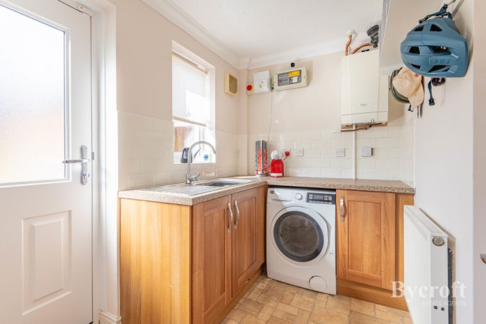 UTILITY ROOM 8' 2" x 5' 8" (2.49m x 1.73m) worktop with base cupboards under, space and plumbing for washing machine, one bowl sink mixer tap, window and door to rear garden, radiator, Baxi 800 gas boiler, extractor. Door into integral garage.